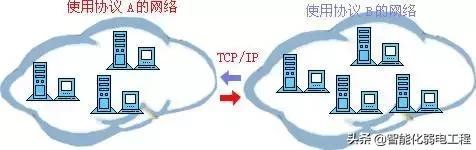 計(jì)算機(jī)網(wǎng)絡(luò)協(xié)議同我們的語(yǔ)言一樣,多種多樣。而ARPA公司與1977年到1979年推出了一種名為ARPANET的網(wǎng)絡(luò)協(xié)議受到了廣泛的熱捧,其中最主要的原因就是它推出了人盡皆知的TCP/IP標(biāo)準(zhǔn)網(wǎng)絡(luò)協(xié)議。目前TCP/IP協(xié)議已經(jīng)成為Internet中的“通用語(yǔ)言”,下圖為不同計(jì)算機(jī)群之間利用TCP/IP進(jìn)行通信的示意圖。