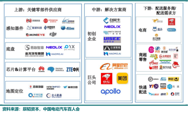 在初步成型的產(chǎn)業(yè)鏈中,上游是硬件和零部件供應(yīng)廠商,涵蓋線控底盤、激光雷達(dá)、攝像頭、計(jì)算平臺(tái)等等,出現(xiàn)了禾賽科技、地平線、毫末智行等企業(yè);中游是解決方案公司,一類是阿里巴巴、京東、美團(tuán)等基于場(chǎng)景進(jìn)場(chǎng)的互聯(lián)網(wǎng)巨頭,一類是白犀牛、新石器、行深智能、毫末智行等有自動(dòng)駕駛研發(fā)和技術(shù)背景的創(chuàng)業(yè)者;下游是電商、商超、快遞、外賣、本地生活等配送需求方。