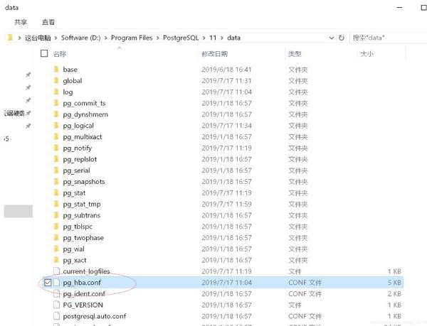 1、找到Postgresql安裝目錄下的data,打開(kāi)文件夾,找到pg_hba.conf